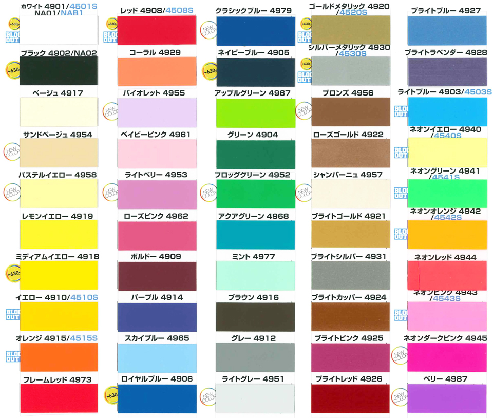 | ※特に蛍光色は、薄くなって見えますが、実物は濃く、明るい色です。 | ||