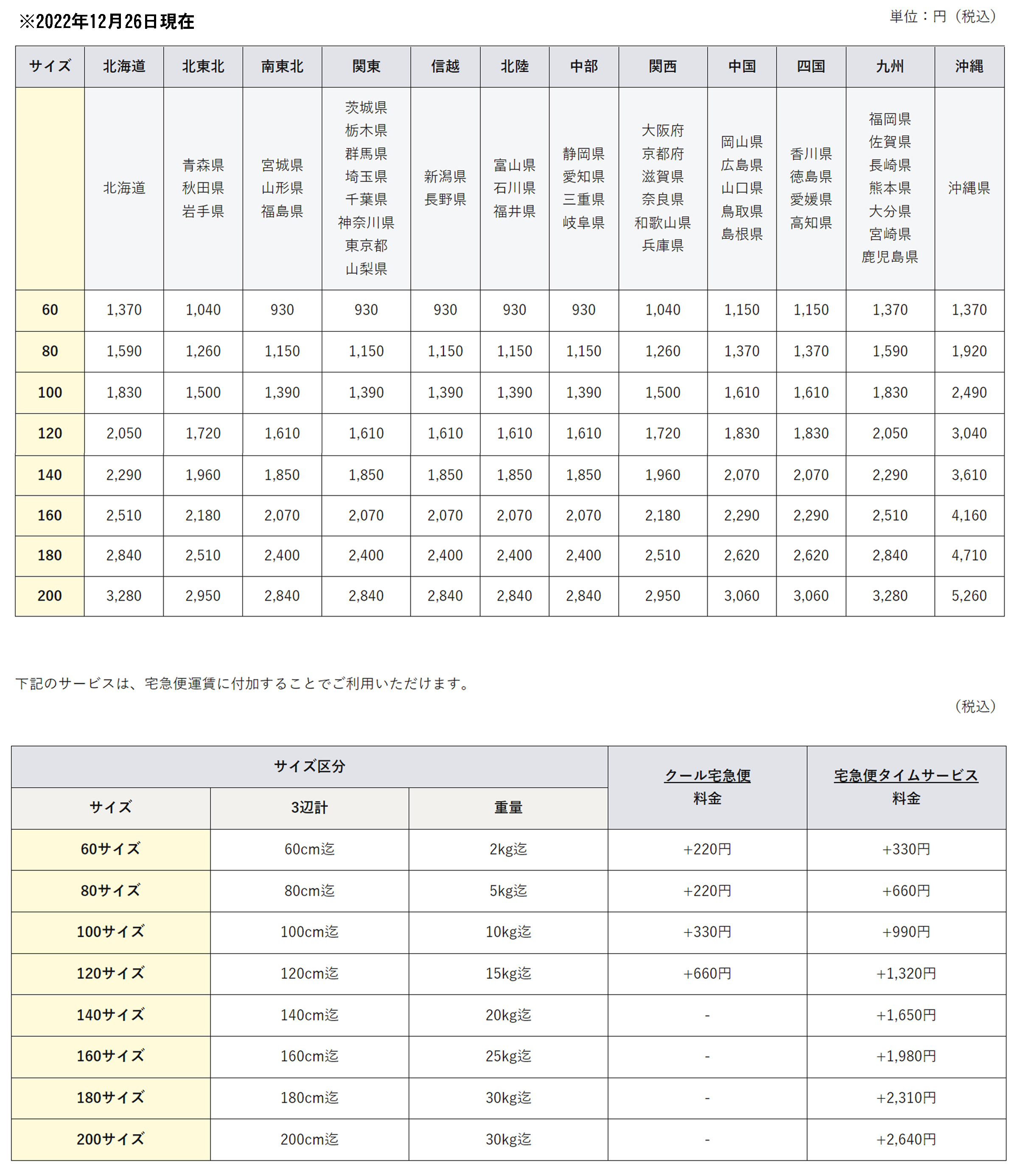 | ※3辺合計が260cm以内、重量50kg以内の、一人での扱いが可能なお荷物が対象となります。 |
